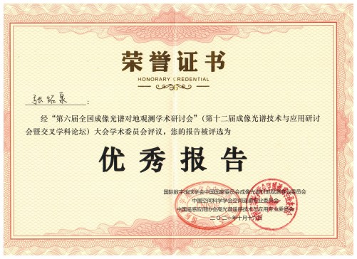 2021年10月14至16日,第六届全国成像光谱对地观测学术研讨会在浙江省宁波市召开。会议以“成像光谱对地观测与生态文明建设”为主题,共谋成像光谱对地观测技术的新发展。我校张绍泉博士应邀在“成像光谱遥感解混与亚像元制图”分会场作题为“联合空谱信息的高光谱遥感图像稀疏解混”的报告,报告介绍了我校智能视觉信息处理与应用团队在高光谱遥感图像空谱稀疏解混方面取得的最新成果,受到与会学者的广泛关注,进一步扩大了我校在相关领域的知名度。经专家评审和大会学术委员会评议,该报告获优秀学术报告奖。另:bwin必赢李璠老师也应邀参会。(文/图 张绍泉)