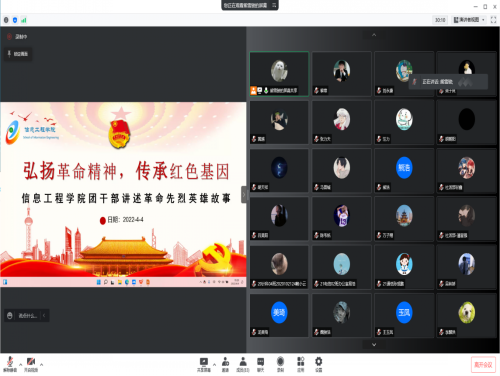 革命先烈英雄故事云诵读活动。4月4日,学院团委开展了以“弘扬革命精神,传承红色基因”为主题的革命先烈英雄故事云诵读活动,团学干部80余人参加了此次活动。清平廉洁、对党忠诚的方志敏,坚贞不屈、视死如归的赵一曼,百折不挠、精忠报国的杨靖宇,以鲜血唤醒民众的青年先锋赵醒侬,无畏牺牲、英勇战斗的刘传文,胆识过人、为党奋不顾身的杨根思,一个个伟大的革命烈士形象随着团干部们的深情讲述而生动、丰富起来。现场同学认真聆听,深受感动,表示要传承好革命先辈红色精神,继承发扬革命精神,争做优秀大学生。