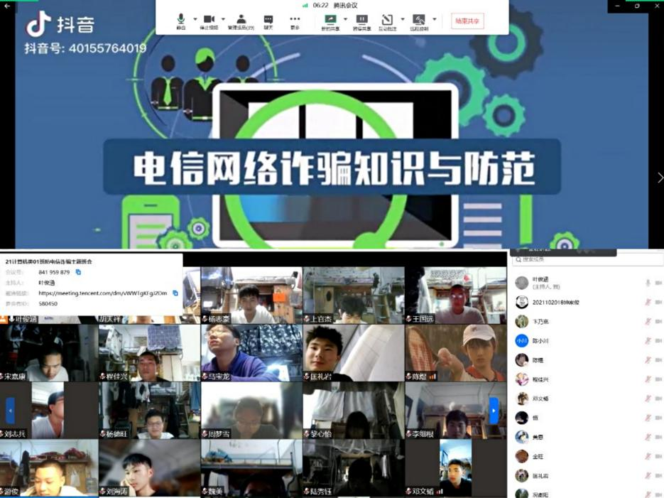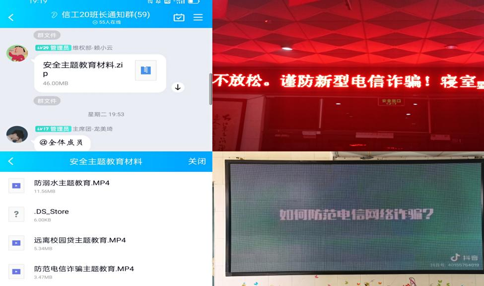 为积极响应疫情防控政策,主题教育以线上方式进行。本次教育活动中,学院在线上动员各班级安全员与班长分享扩散安全教育知识资料至班群中,在线下通过各楼栋的电子屏幕播放安全教育短片,以达到防诈骗宣传处处有,防诈骗知识让人人知。同时,各班级在线上开展主题班会,在班主任和班委的协同组织下,同学们通过PPT和相关科普视频进行主题学习。会上,安全委员解释了电信网络诈骗的定义,介绍了电信网络诈骗的一般流程,透彻分析了诈骗的常用手段与套路,并与同学们讨论发表了辨明电信诈骗的方法,告诫同学们提高警惕,切勿落入骗局。随后,班主任结合真实案例,说明了遭遇诈骗和校园贷后要冷静思考、保留证据、及时上报的正确做法,最后要求同学们遵守“三不”准则防范电信网络诈骗。