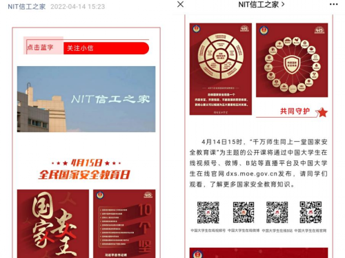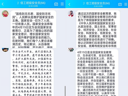 活动中,学院各班级在线上主题班会上,以改编歌曲歌词的形式积极宣传全民国家安全教育日,将国家安全知识融入歌词,引导同学们主动学习了解国家安全。同时,学院组织各班级安全员线上收看国家安全教育公开课,课后安全员们就国家安全分享学习体会,并将理论联系实际,将带领班级同学树立正确的国家安全观与责任意识,做到“国家安全,人人有责”。 另外,为进一步加强国家安全宣传,学院公众号推出全民国家安全教育日主题推文,强化对国家安全以及相关知识的了解,牢固树立了国家安全无小事,维护国家安全必须从自身做起的观念。