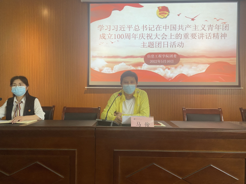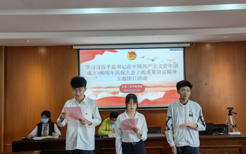 活动中,学院党委副书记马俊要求大家深刻学习领悟习近平总书记重要讲话精神,并提出三点希望:一是坚定不移听党话、跟党走,勇做走在时代前列的奋进者、开拓者、奉献者;二是不负韶华,不负时代,不负人民,做德智体美劳全面发展的新时代青年;三是要用行动践行讲话精神,用内心感应时代脉搏,书写绚烂多彩的青春答卷。与会师生对习近平总书记重要讲话精神进行了深入的学习,并结合实际进行了热烈的讨论。青年团员代表们通过诗朗诵《迎团百年礼,青春正当时》,表达了建团百年的祝福之情,坚定了永跟党走,做优秀共青团员的决心。