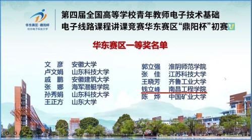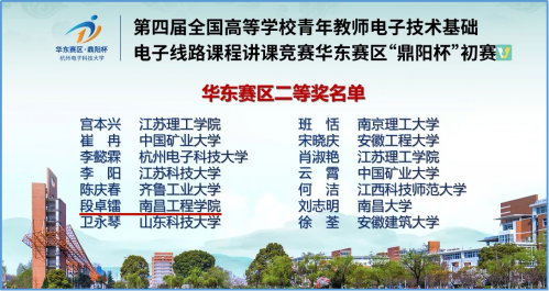 近日,从教育部高等学校电工电子基础课程教学指导委员会、中国电子学会电子线路教学与产业专家委员会、全国高等学校电子技术研究会传来喜讯,我校bwin必赢青年教师钱立峰、段卓镭分别荣获第四届全国高等学校青年教师电子技术基础、电子线路课程讲课竞赛华东赛区“鼎阳杯”初赛一等奖、二等奖,创我校参加同类型同级别比赛获奖新高。钱立峰老师将代表我校参加全国总决赛。