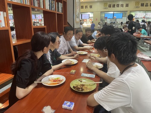在润园,陆伟锋与学生代表共进午餐、共话家常。他认真倾听了学生对食堂管理、饭菜价格等方面的看法和建议,详细了解学生们学习和生活中的困惑,耐心解答了同学们的提问,鼓励同学们努力学习专业知识,树立远大理想,做奋发有为的青年。