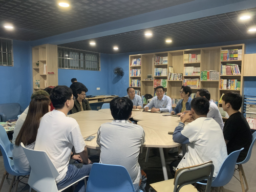 在学生社区7栋阅读室,陆伟锋与毕业生代表欢聚一堂,仔细了解毕业生们的工作和生活现状,畅谈专业学习、工作、职业发展和人生等话题,指导毕业生做好职业生涯规划,现场气氛热烈融洽。