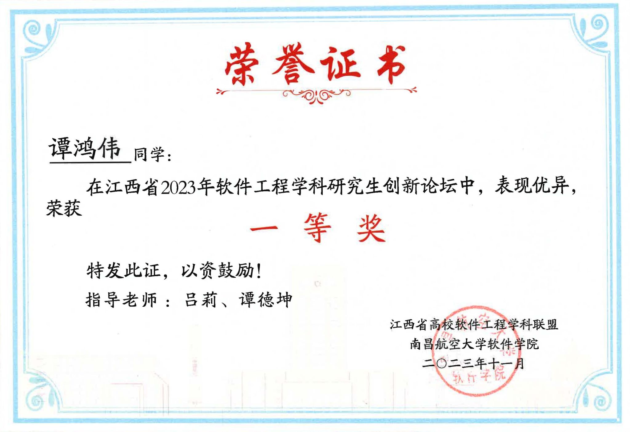 11月25日,由江西省学位与研究生教育学会、江西省教育厅主办,江西省高校软件工程学科联盟(南昌航空大学)承办的江西省2023年软件工程学科研究生学术创新论坛在南昌航空大学综合楼顺利举行。我校荣获一等奖1项、二等奖1项、三等奖4项以及优秀奖若干的好成绩。其中,2022级电子信息专业学位硕士研究生谭鸿伟同学的作品“基于近邻与代表点的密度峰值聚类算法”获得一等奖,指导老师为bwin必赢吕莉教授、谭德坤博士。