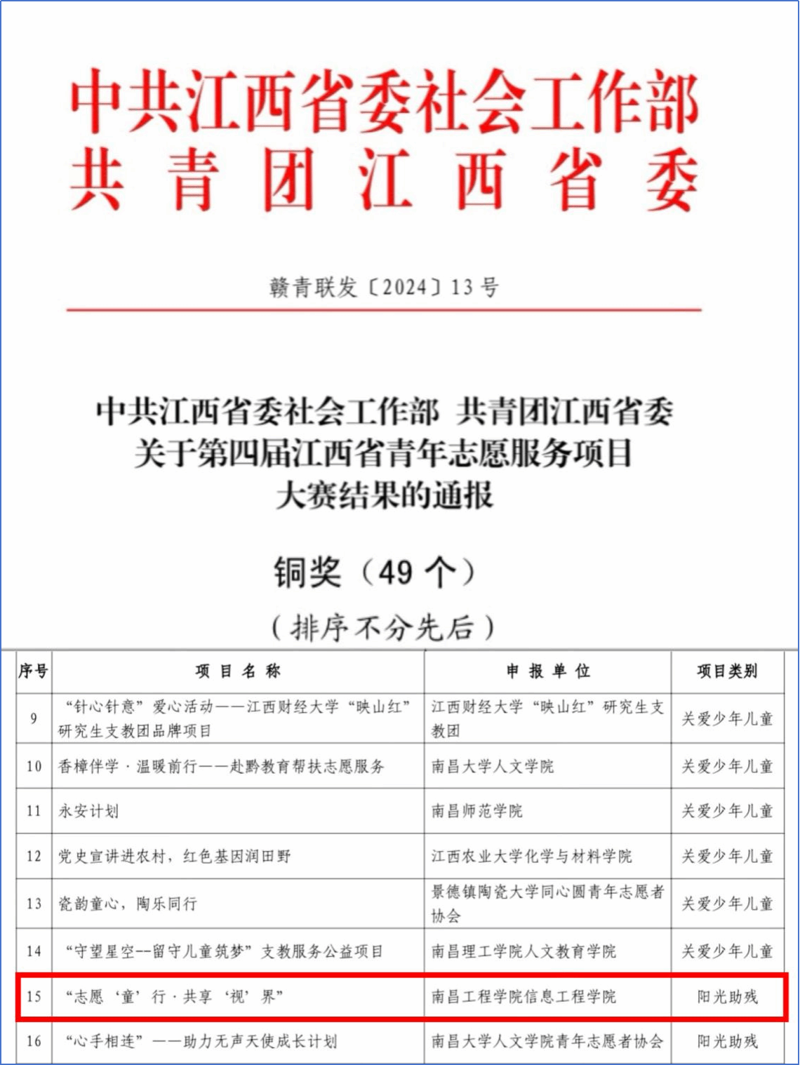 5月13日,由共青团江西省委、中共江西省委社会工作部、南昌大学主办,江西省青年志愿者协会、共青团南昌大学委员会承办的第四届江西省青年志愿服务项目大赛暨志愿服务交流活动落下帷幕。经过初赛、项目展示、决赛路演和答辩等环节,我校选送的bwin必赢志愿服务项目《志愿“童”行·共享“视”界》项目荣获铜奖。