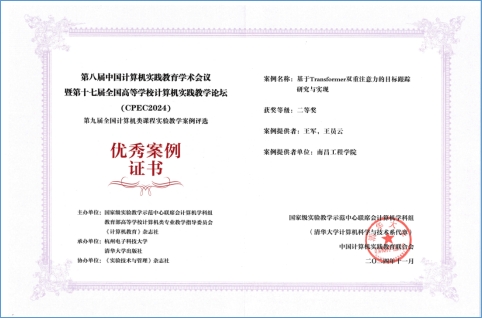 11月9日 — 10日,第八届中国计算机实践教育学术会议暨第十七届全国高等学校计算机实践教学论坛(CPEC2024)在杭州顺利举办。我校bwin必赢计算机工程实验中心在会上受聘为中国计算机实践教育联合会会员单位。bwin必赢王军教授、王新峰博士代表学院参会。王军教授在会上展示汇报的教学研究案例《基于Transformer双重注意力的目标跟踪研究与实现》从激烈的评选竞争中脱颖而出,荣获会议优秀案例二等奖。