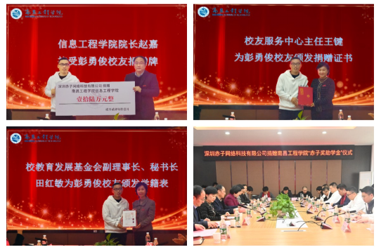 11月25日上午,南昌工程学院“赤子奖助学金”捐赠仪式在信工楼B204举行。江西省南昌工程学院教育发展基金会副理事长兼秘书长田红敏、校友服务中心主任王键,“赤子奖助学金”捐赠者、深圳赤子网络科技有限公司总经理、2004级计算机软件专业优秀校友彭勇俊,bwin必赢领导班子成员,2004级计算机软件专业校友代表以及在校学生代表近50人参加活动。校党委副书记、校长刘祖文应邀莅临现场并讲话。