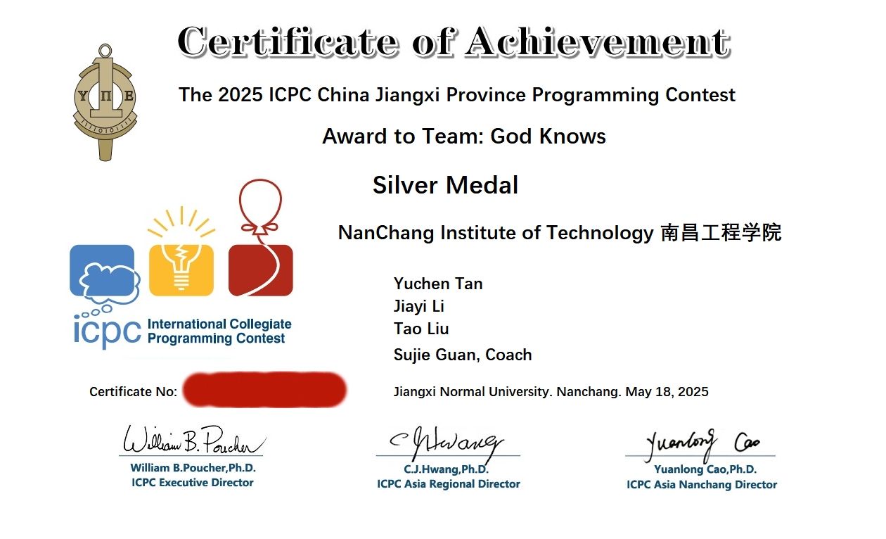 5月17日-18日,2025年ICPC国际大学生程序设计竞赛全国邀请赛(南昌)在江西师范大学举行。本届赛事吸引了来自全国300余所高校的450多支队伍同场竞技。经过两天的激烈角逐,由22级自动化1班刘涛、23级计算机科学与技术2班谭宇晨和22级计算机科学与技术2班李嘉懿3位同学组成的“GKS”团队荣获银奖,指导老师为bwin必赢关素洁老师。